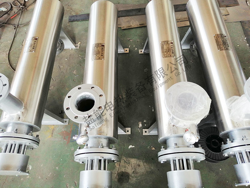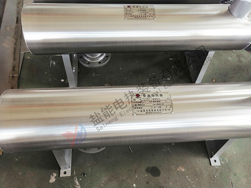 管道式液體加熱器是主要對液體流進行加熱的電加熱設(shè)備。加熱器的發(fā)熱元件為不銹鋼電加熱管,加熱器內(nèi)腔設(shè)有多個折流板(導(dǎo)流板),引導(dǎo)液體流向,延長液體在內(nèi)腔的滯留時間,從而使液體充分加熱,使液體加熱均勻,提高熱交換效率。加熱器的加熱元件為不銹鋼無縫鋼管內(nèi)裝入電熱絲,空隙部分填滿有良好導(dǎo)熱性和絕緣性的氧化鎂粉后縮管而成的。當電流通過高溫電阻絲的時候,產(chǎn)生的熱通過結(jié)晶氧化鎂粉向加熱管表面擴散,再傳遞到被加熱液體中去,以達到加熱的目的。